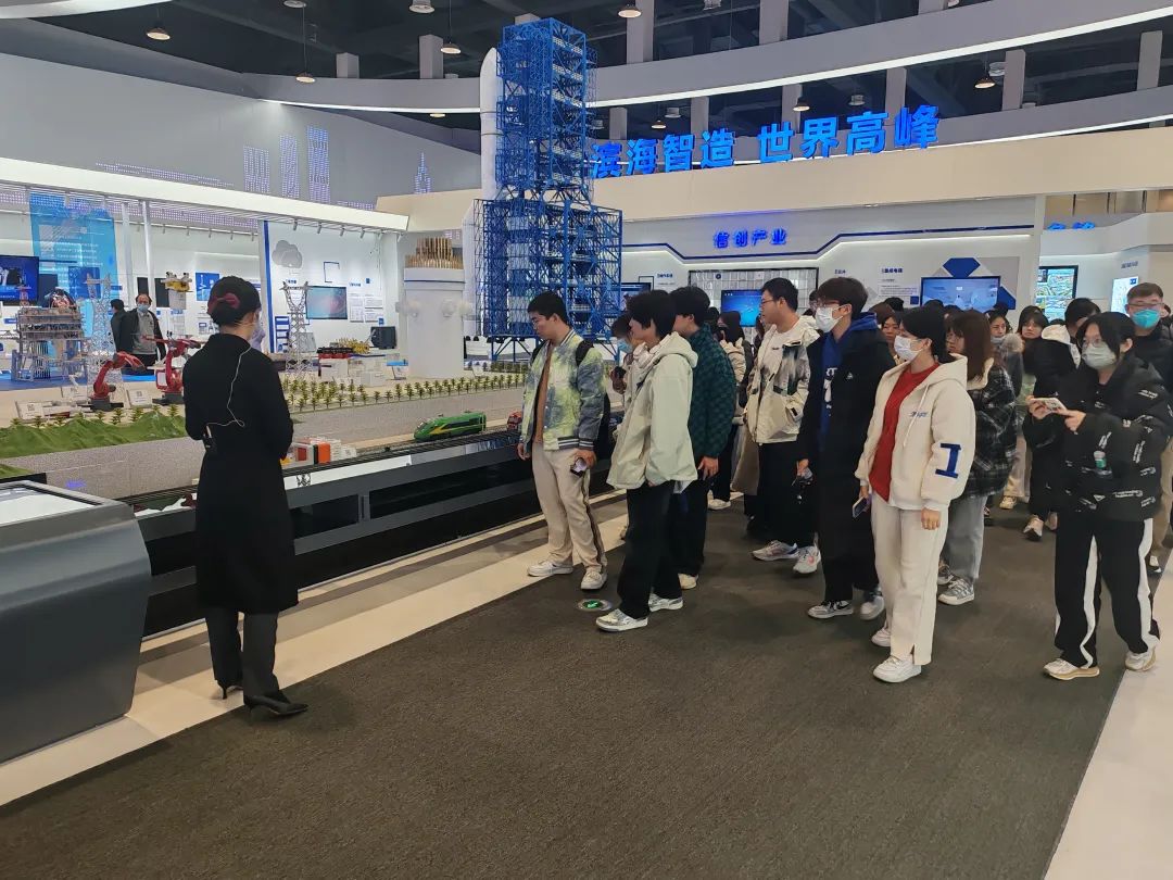 在滨海新区产业交流中心,同学们通过观看专题片《面向世界的滨海制造》,参观国之重器、生物医药、信创产业和专精特新四个版块成果展,以及老字号展区、滨海智造展区、主题园区展区及滨海创造展区产品模型、图像简介和智能屏幕等形式的生动展示,既深刻把握了滨海新区面向世界的制造业整体布局概况,又整体直观地认识了滨海新区现代化产业的创造性转变和创新性发展。
