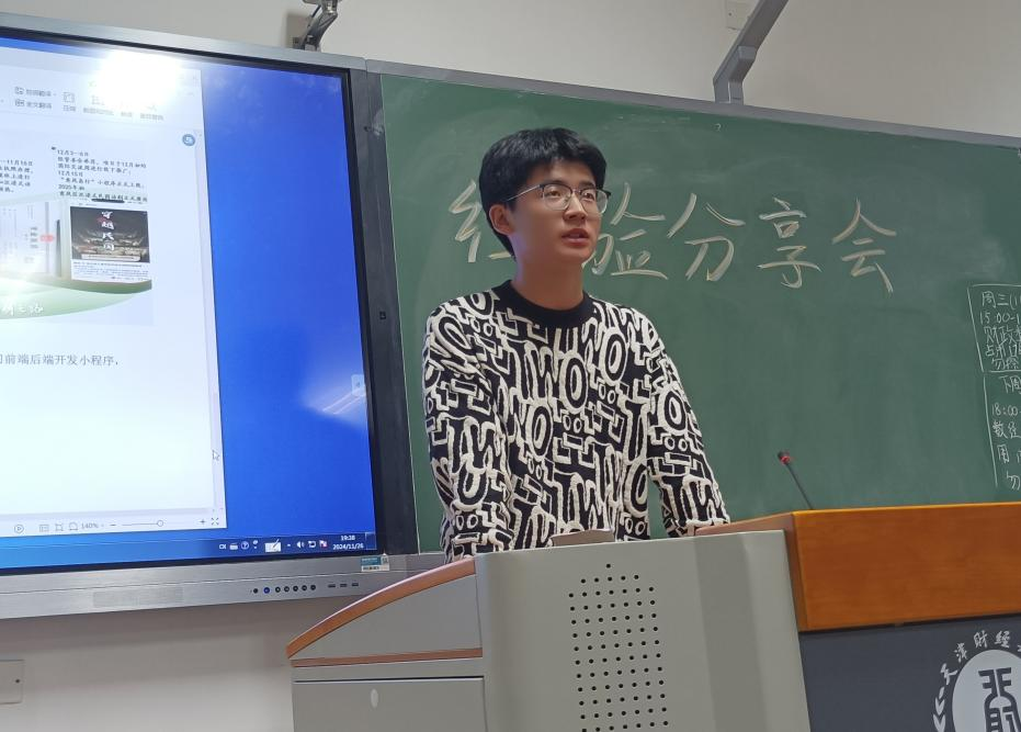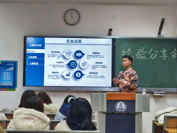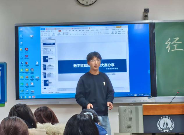 接下来,同样是在全国大学生数字贸易综合技能大赛中荣获全国一等奖的周俊安、温卓羲两位同学的代表他们的团队上台发言,他们所选择的是大数据分析赛道。他们分别从报名信息、前期准备、过程感想以及比赛收获四部分展开介绍,着重向大家讲解了这个赛道所需具备的数据分析能力和知识储备。当然,明确的团队分工和清晰的写作思路也同样重要。通过这次比赛,团队成员不仅提升了自己的能力,还更加体会到团队协作的重要性。