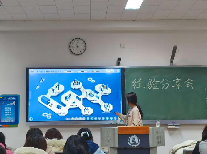 首先是刘艺飞和秘文迪两位同学进行分享,她们的团队在全国大学生数字贸易综合技能大赛——创新创业赛道中荣获全国一等奖。她们分别从赛前准备、比赛的三个阶段以及想对大家说的话三部分展开讲述,使大家对数字贸易大赛的比赛流程有了进一步了解,同时明白了相信队友的重要性,一旦参赛,便要勇往直前、全力以赴!